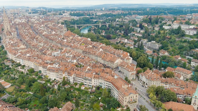 Берн, Швейцария. Бернский собор. Панорама города с видом на исторический центр. Летнее утро, вид с воздуха