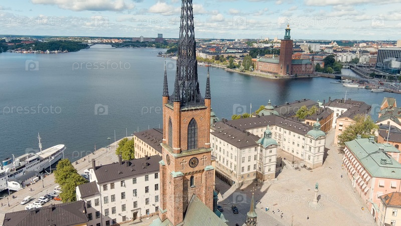 Стокгольм, Швеция. Остров Риддархольмен и озеро Маларен. Церковь Риддархолмен. Панорама города. Летний день, Aerial View