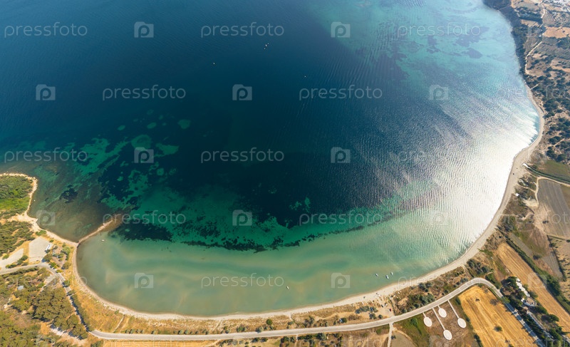 Седдулбахир, Турция. Вид сверху вниз на залив Эртугрул с яркой голубой водой, небольшими лодками и историческим посадочным пляжем союзников на полуострове Галлиполи. Вид с воздуха