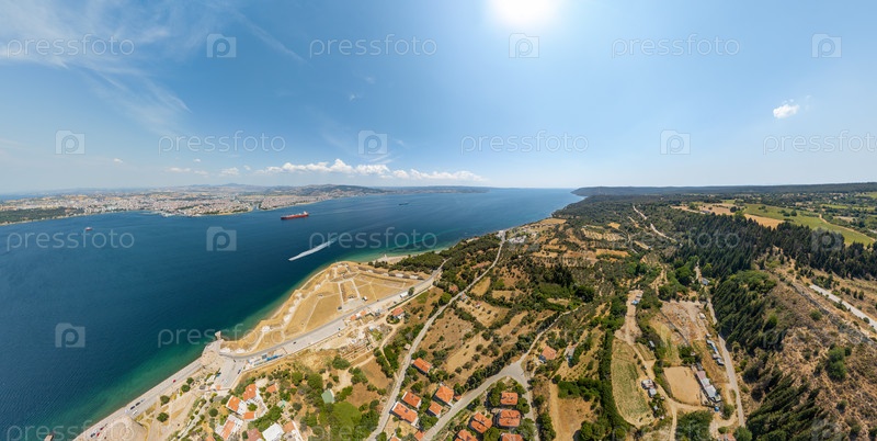 Канаккале, Турция. Панорамный вид с воздуха на морское движение Дарданеллского пролива с танкерами, грузовыми судами, паромами и городом Канаккале с крепостями. Вид с воздуха