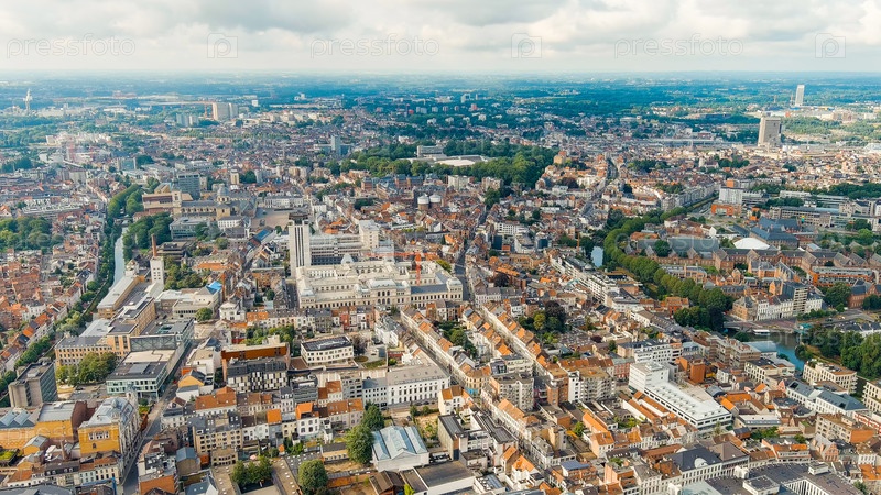 Гент, Бельгия. Панорама города с воздуха. Облачная погода, летний день, вид с воздуха