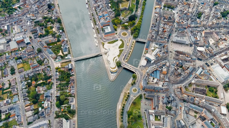 Намюр, Бельгия. Citadelle de Namur — крепость 10 века с парком, перестраиваемая несколько раз. Панорама центральной части города. Ривер Маас. Летний день, Aerial View