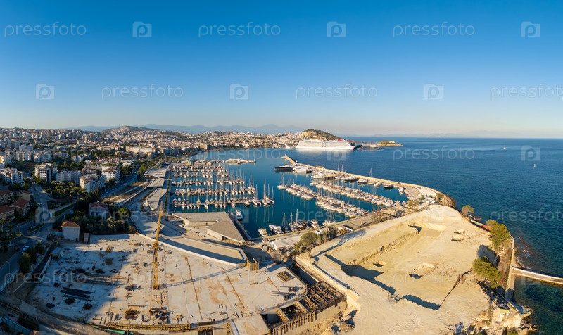Кусадаси, Турция. Вид с воздуха на яхтенную пристань с заливом и круизным лайнером на пирсе в фоновом режиме. Морская сцена с рекреационными и коммерческими судами. Вид с воздуха