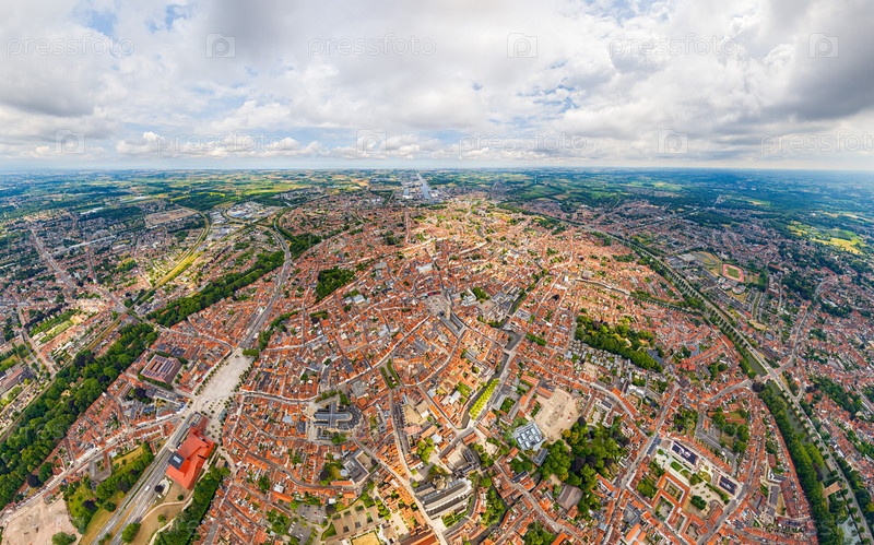 Брюгге, Бельгия. Центр города и окрестности. Жилые и промышленные зоны. Панорама города. Летний день, облачная погода. Вид с воздуха