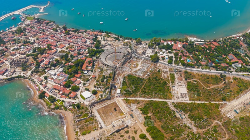 В сторону, Манавгат, Турция. Панорамный вид с воздуха на древний полуостров с римским амфитеатром, храмом Аполлона, Агорой, Монументальными воротами, музеем и византийской больницей летом. Вид с воздуха