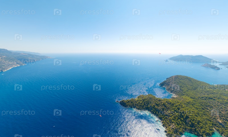 Олудениз, Турция. Воздушная панорама живописного залива со Средиземным морем и покрытыми лесом горными склонами под ясным летним небом. Вид с воздуха