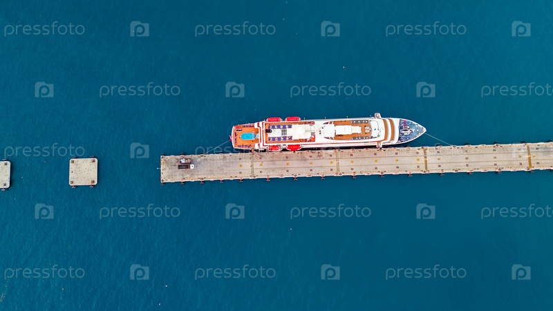 Кусадаси, Турция. Сверху вниз открывается вид на круизное судно в порту, переход к панорамному виду на город, освещенный закатом. Вид с воздуха