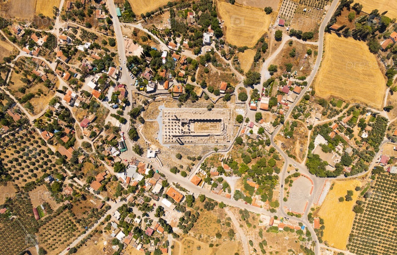 Дидим, Турция. Абстрактный геометрический рисунок сверху, показывающий древние руины храма, контрастирует с организованными сельскохозяйственными угодьями и городскими сооружениями. Вид с воздуха