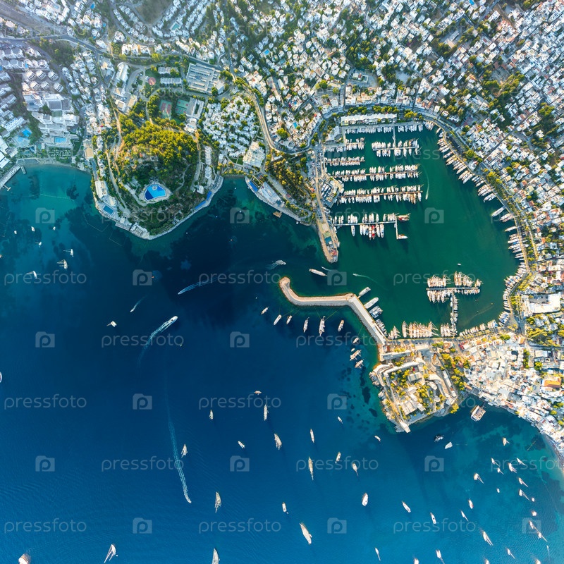 Бодрум, Турция. Сверху вниз вид на вход яхты Bodrum, замок, холм Tiger Tower, пляжи, яхты в заливе и плоские крыши домов. Вид с воздуха