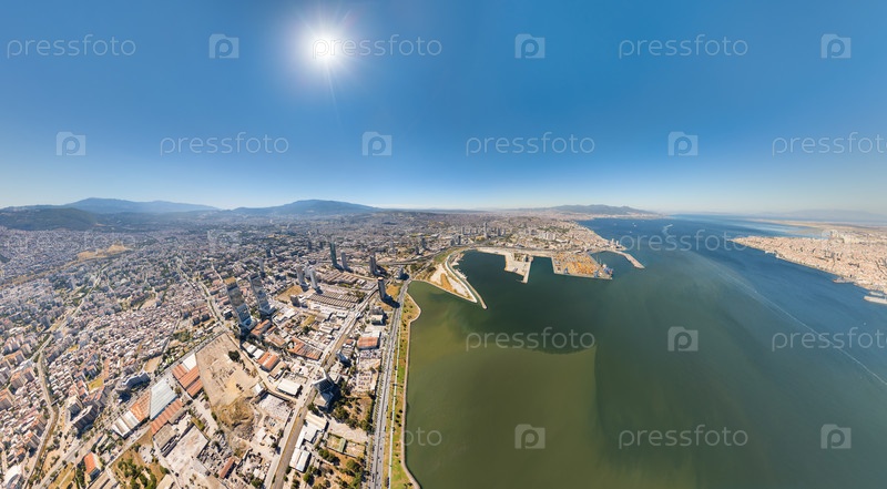 Измир, Турция. Воздушный панорамный вид с Байракли в сторону центра города и входа в бухту. Набережная, небоскребы, порт, отдаленный центр города и проход в залив. Летний день. Вид с воздуха