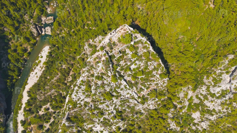 Какаллар, Алания, Турция. Аэрофотосъемка исторической достопримечательности замка Алара при летнем дневном свете. Вид с воздуха