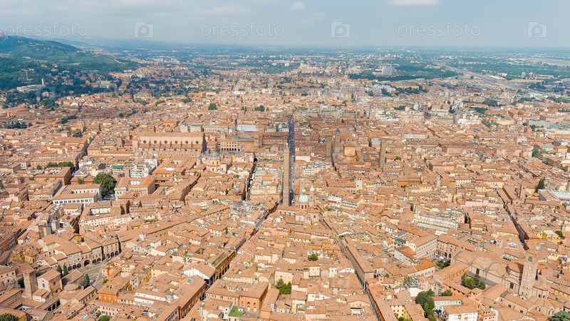 Болонья, Италия. Старый город. Две башни. Гарисенда и Дегли Асинелли. Башни 12-го века. Лето, вид с воздуха