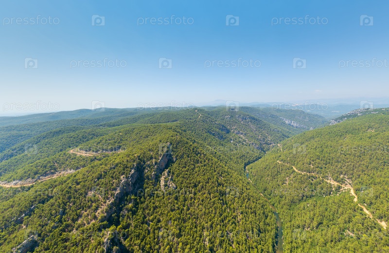 Какаллар, Алания, Турция. Воздушная панорама речной долины с извилистой рекой, хвойный лес, покрывающий горные склоны под ясным небом. Вид с воздуха