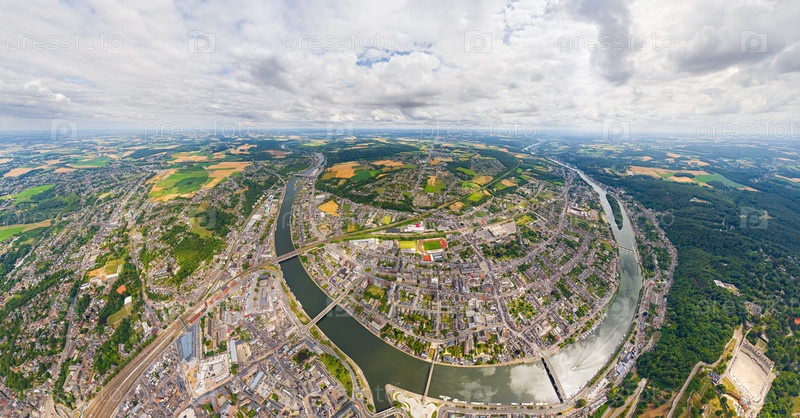 Намюр, Бельгия. Панорама города. Летний день, облачная погода. Вид с воздуха