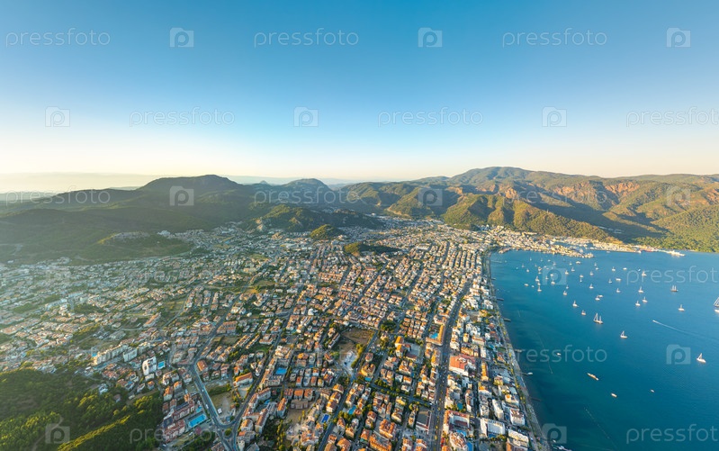 Мармарис, Турция. Панорамный вид на город, горы, береговую линию с отелями и пляжами, бухту с яхтами при закате. Прибрежный городской пейзаж. Вид с воздуха