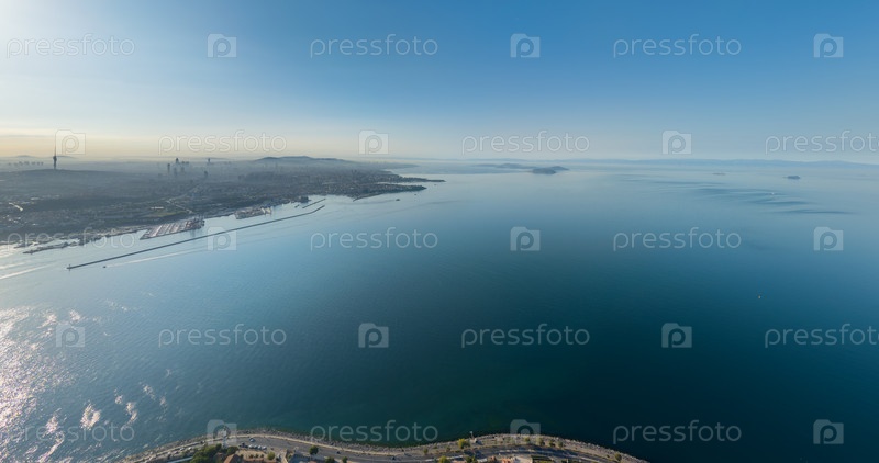 Стамбул, Турция. Вид воздушного дрона на слияние пролива Босфор и Мраморного моря. Водная поверхность и горизонт. Вид с воздуха