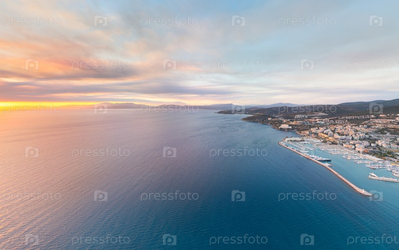 Кусадаси, Турция. Вид с воздуха на далекие горы, залив и яхтенную пристань. Прибрежный ландшафт с рекреационными объектами. Вид с воздуха