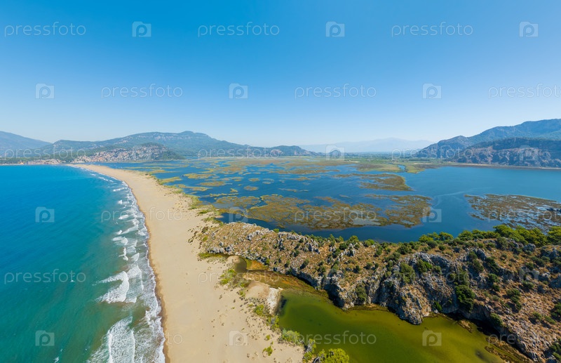 Дальян, Турция. Кадры дронов, показывающие волны Средиземного моря, сходящиеся с течениями пролива Далянь на береговой линии Черепашьего пляжа Изтузу. Вид с воздуха