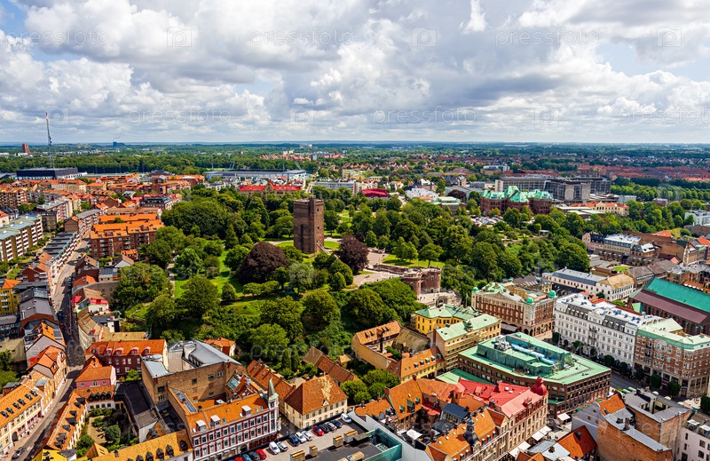 Хельсингборг, Швеция. Карнан. 35-метровая башня средневекового замка. Панорама города летом. Вид с воздуха