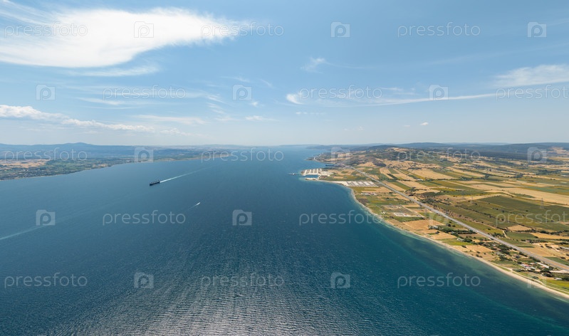 Лапсеки, Турция. Воздушная панорама пролива Дарданеллы с двумя грузовыми судами, плавающими между европейскими и азиатскими берегами вблизи прибрежных полей. Вид с воздуха