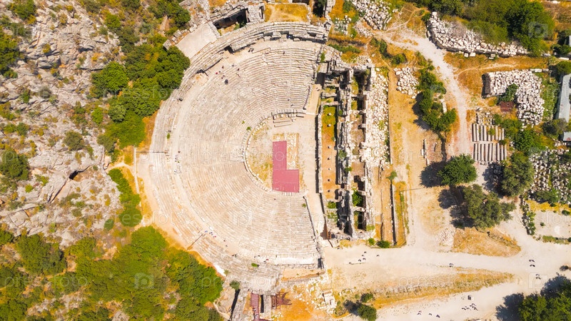 Демре, Турция. Сверху вниз симметричный вид с воздуха на древний амфитеатр Мира, показывающий идеальный дизайн круговой структуры. Вид с воздуха