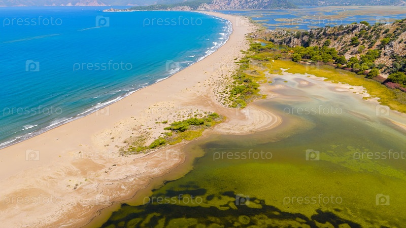 Дальян, Турция. Панорамное беспилотное видео береговой линии пляжа Изтузу, устья реки Далянь и гор, идеально подходит для путешествий и летних каникул в Турции. Вид с воздуха