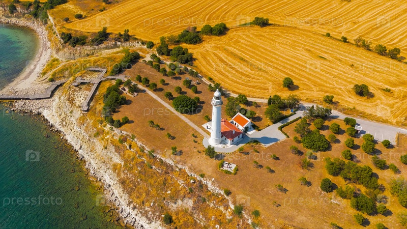Седдулбахир, Эцеабат, Турция. Вид с воздуха на маяк Mehmetcik Feneri на мысе Хеллес с проливом Дарданелл и точкой встречи Эгейского моря. Панорама солнечного дня. Вид с воздуха.. Вид с воздуха