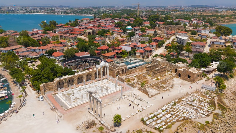 В сторону, Манавгат, Турция. Храм Аполлона и Афины под ярким летним солнцем, древние гавани и руины южной базилики на побережье Средиземного моря. Вид с воздуха