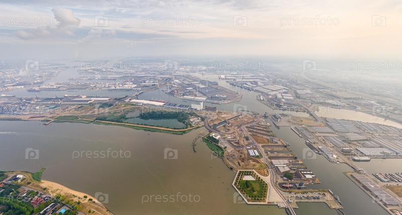 Антверпен, Бельгия. Панорама города. Река Шельда (Escout). Летним утром. Вид с воздуха