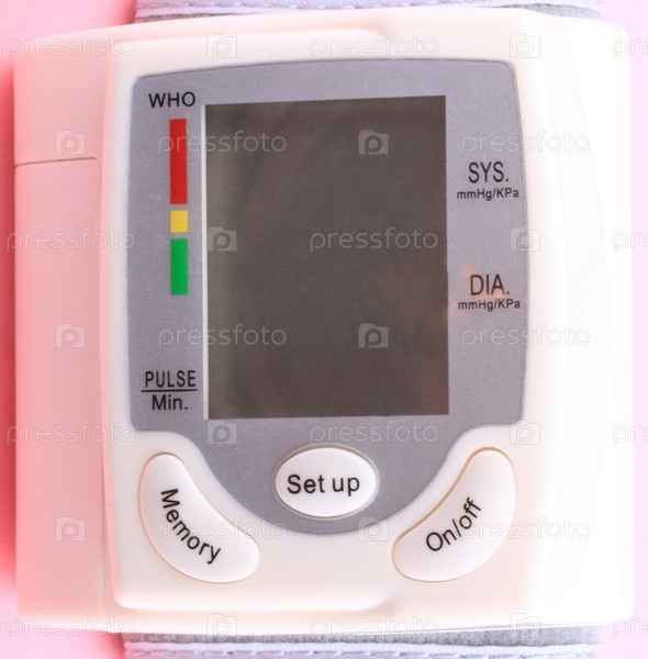 Автоматический наручный цифровой монитор артериального давления на розовом фоне в сухой день