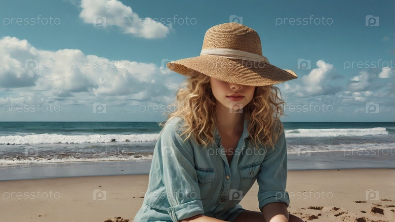 Женщина на отдыхе, сидящая в купальнике и широкополой соломенной шляпе на пляже в солнечный день и глядящая на море