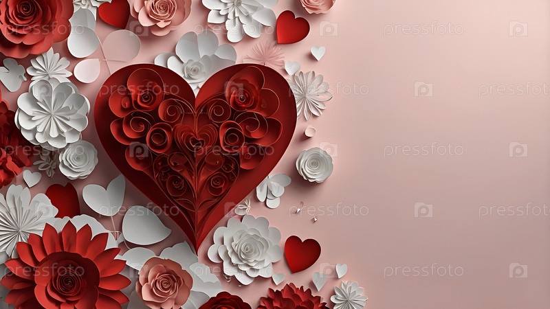Концепция Дня святого Валентина с красным сердцем, изображающим Любовь. Стильный дизайн бумажных срезанных цветов. Место для копирования