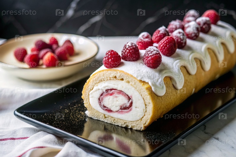 Швейцарская губка с малиной, вкусный фруктовый и кремовый десерт, наполненный сливочным сыром, украшенный свежей малиной