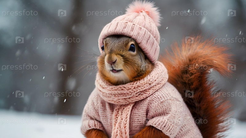 Смешная белка с большими щеками, одетая в уютную мягкую розовую теплую одежду, шляпу и шарф на зимнюю тему. Сезонные обои