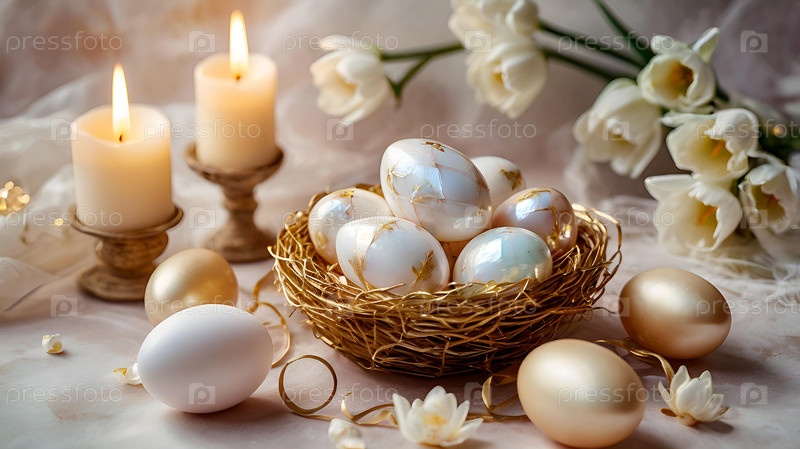 Концепция яркого пасхального праздника. Нежные пасхальные яйца в жемчужной корзине и нежные цветы на пастельно-водяном фоне