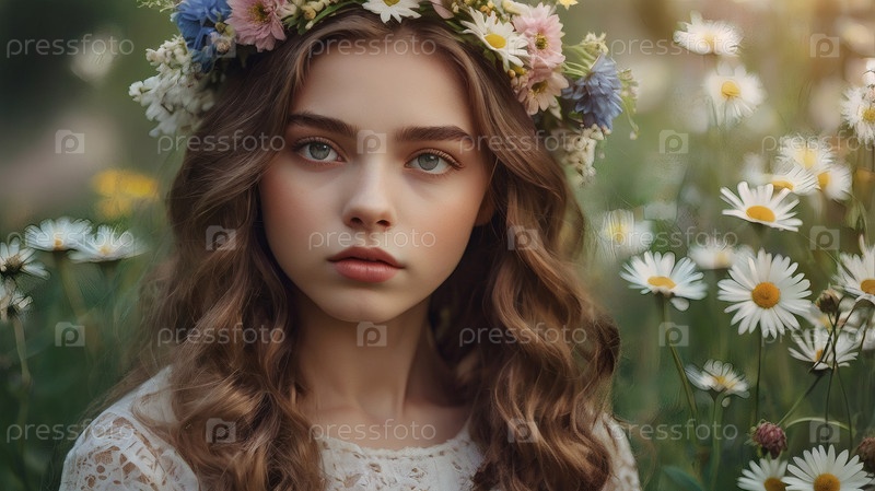 Красивая девушка с венком из ромашек и кукурузных цветов на голове в поле. День святых Петра и Февронии. Всероссийский день семьи, любви, верности