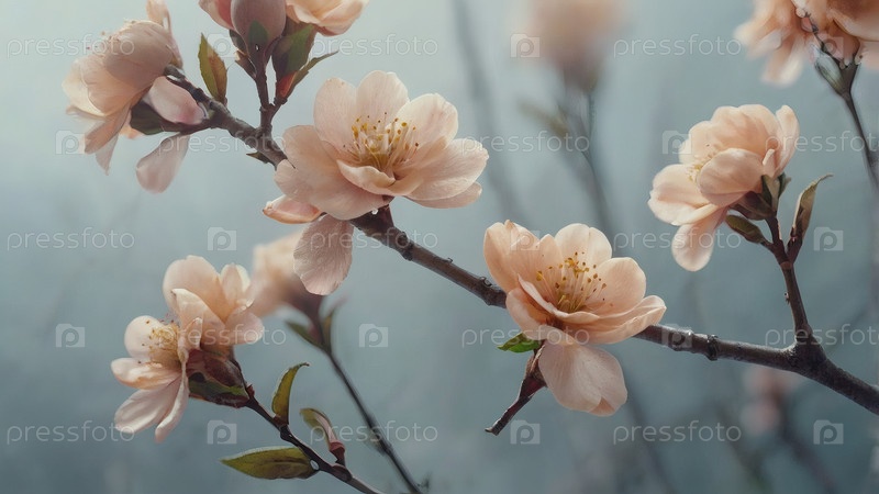 Цветочный фон с красивым эффектом боке. Рядом с цветущим деревом. Цветущий абрикос весной на серо-голубом фоне