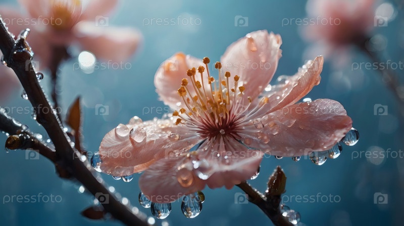 Минимализм. Цветы на ветвях дерева. Цветет розовое дерево сакуры, мокрое от дождя. Наступила весна, и природа оживает. Красивые цветы с каплями воды