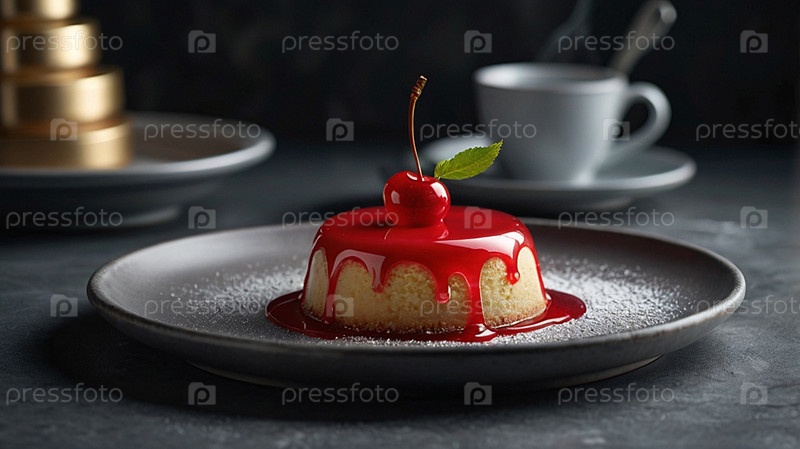 Вкусный, губчатый торт с вишней с украшением в виде вишни на серой керамической пластине. Очень вкусный десерт крупным планом