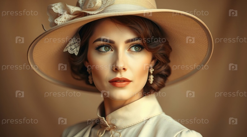 Минимализм. Студийный портрет стильной, элегантной женщины в ретро платье и большой шляпе с луком. Мода 1950-х годов. В прошлом веке