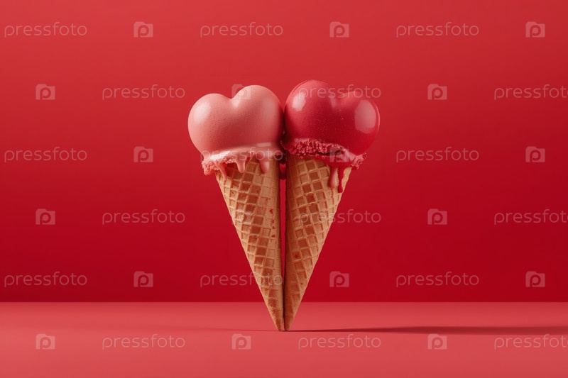 Сладкий десерт. Любовь к мороженому. Минимализм. Два вафельных шишка в форме сердца на красном фоне. Концепция Дня святого Валентина. Баннер, реклама