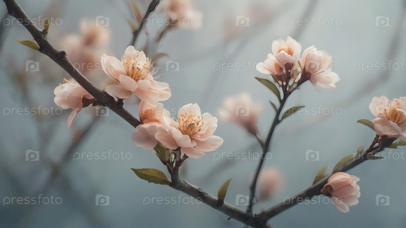 Цветочный фон с красивым эффектом боке. Рядом с цветущим деревом. Цветущий абрикос весной на серо-голубом фоне
