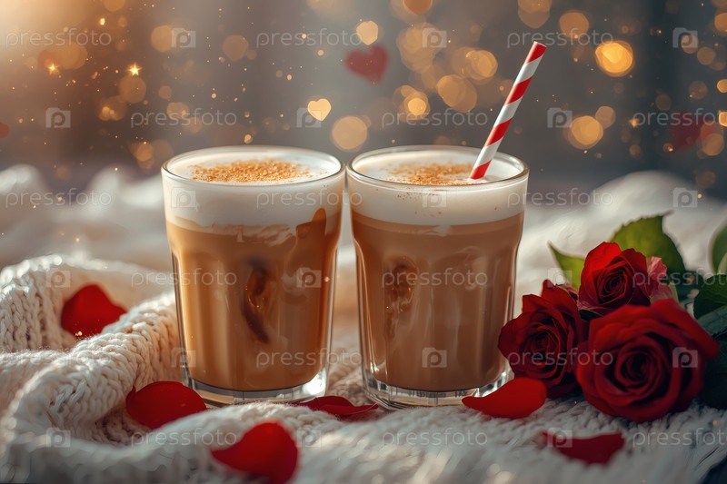 Концепт кафе или кафе в честь Дня святого Валентина. Вкусный многослойный кофе в прозрачном стакане, сердца и лепестки роз крупным планом