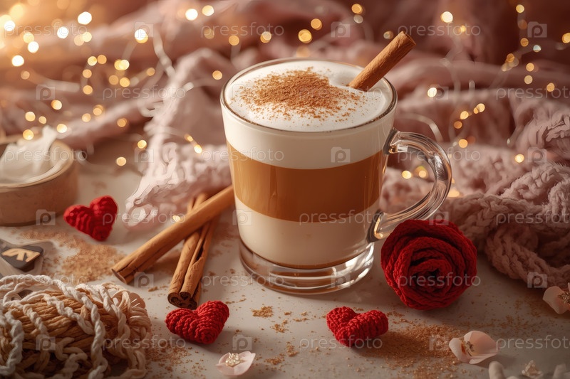 Концепт кафе или кафе в честь Дня святого Валентина. Вкусный многослойный кофе в прозрачном стакане, сердца и лепестки роз крупным планом