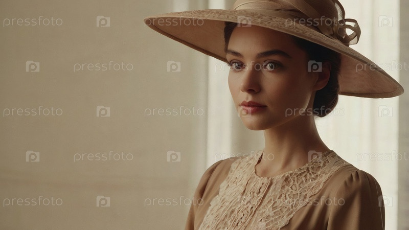 Минимализм. Студийный портрет стильной, элегантной женщины в ретро платье и большой шляпе с луком. Мода 1950-х годов. В прошлом веке