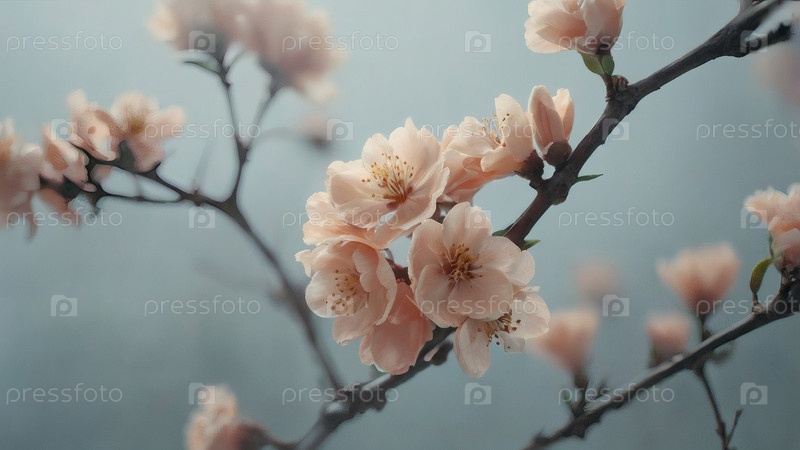 Цветочный фон с красивым эффектом боке. Рядом с цветущим деревом. Цветущий абрикос весной на серо-голубом фоне