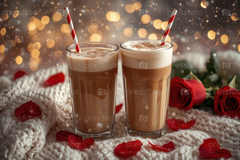 Концепт кафе или кафе в честь Дня святого Валентина. Вкусный многослойный кофе в прозрачном стакане, сердца и лепестки роз крупным планом