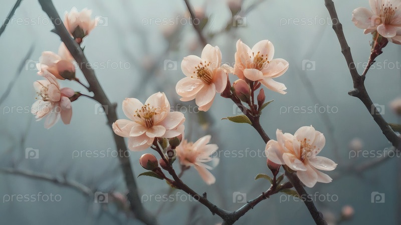 Цветочный фон с красивым эффектом боке. Рядом с цветущим деревом. Цветущий абрикос весной на серо-голубом фоне