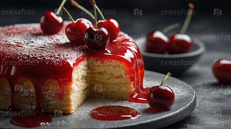 Вкусный, губчатый торт с вишней с украшением в виде вишни на серой керамической пластине. Очень вкусный десерт крупным планом