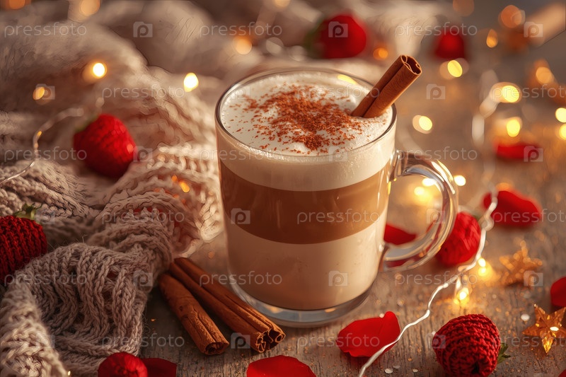 Концепт кафе или кафе в честь Дня святого Валентина. Вкусный многослойный кофе в прозрачном стакане, сердца и лепестки роз крупным планом